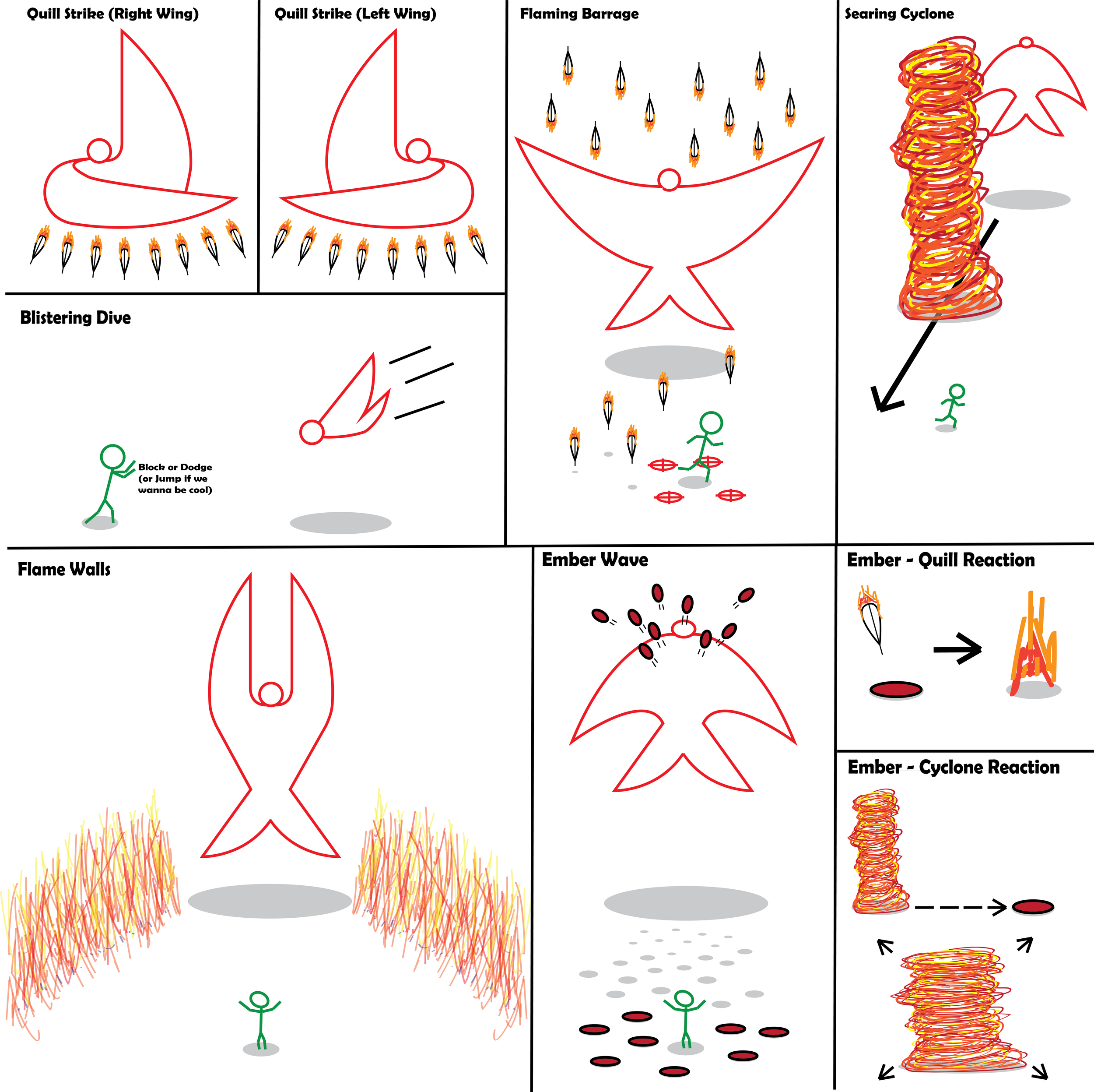 I gave the Phoenix a larger pool of attacks to use and expanded them to be more interactive with each other, allowing some moves to create obstacles or empower an attack. The most important part of my design philosophy is the attention I place on player agency and making sure that the combat does not railroad the player into a certain play style.